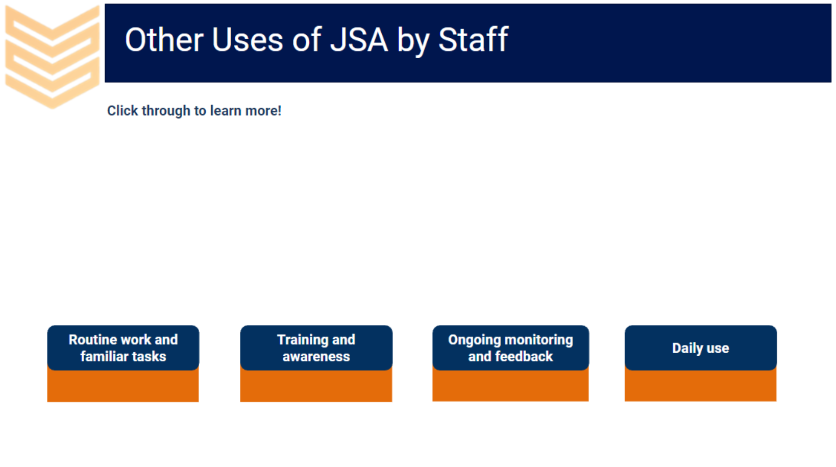 - As a refresher for teams involved in preparing, reviewing, or approving JSAs